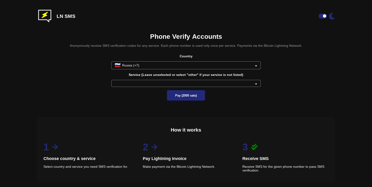 LN SMS - Anonymously receive SMS verification codes, payments via Bitcoin Lightning.
