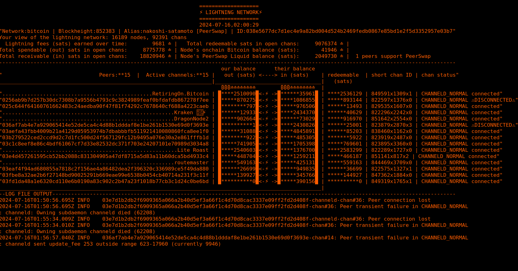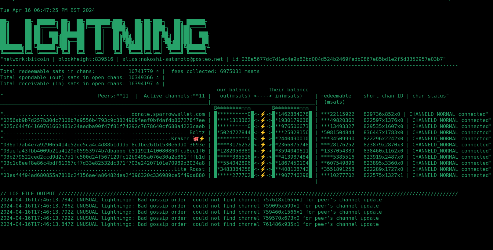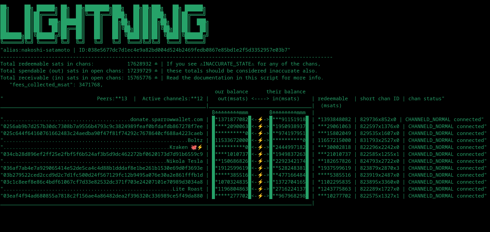 This is a simple shell script I typed together that utilizes jq for presenting information visually in the terminal for Core Lightning. The only dependency is jq for parsing json. And jq is in itself also minimal software and easy to compile from source-code if you feel the need to. With ln-term being a shell script, it also has the benefit of being transparent and does not need compiled. Making it very easy for anyone to audit and modify.