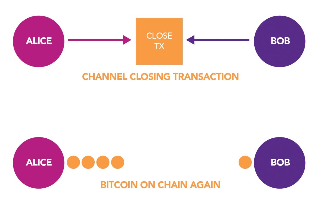 Settlement process: When the channel closes, the current balances are settled on the Bitcoin blockchain. Using the previous example, Alice receives 0.4 BTC and Bob receives 0.1 BTC in their respective wallets.