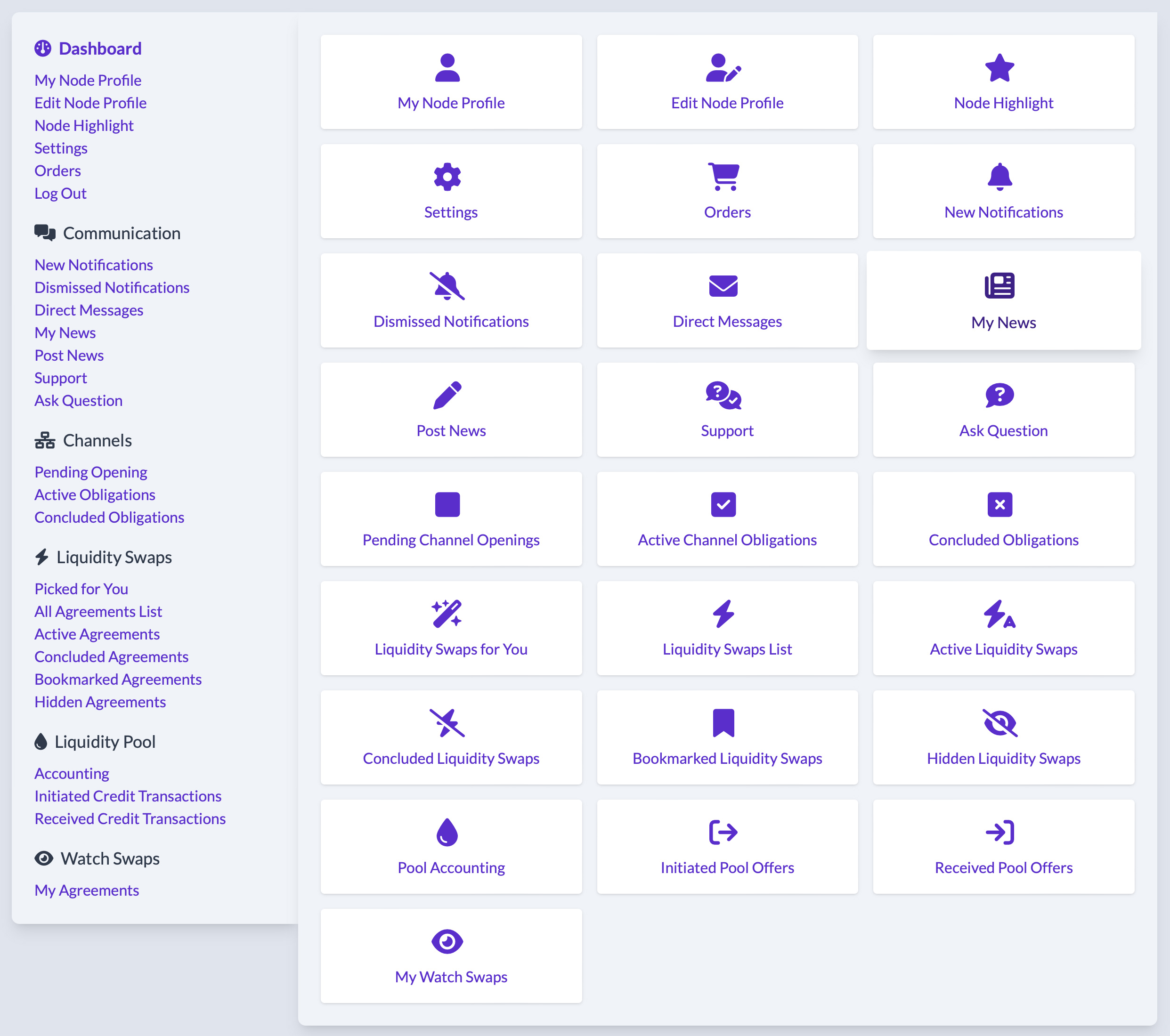 - Liquidity Swaps: Active Agreements – View a grid of cards representing all active Liquidity Swaps, where the agreement's end date has not yet been reached. Keeping these swaps active involves maintaining the associated channels open.
