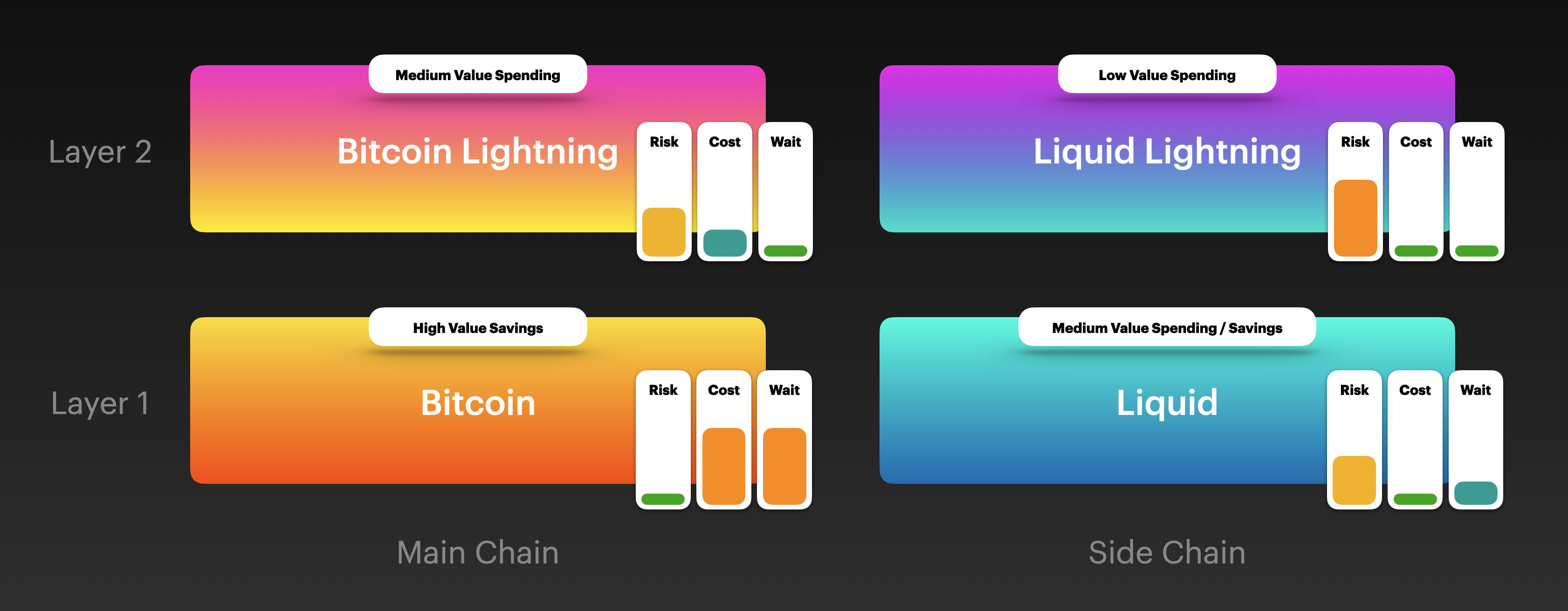 The Liquid Network presents a dynamic scalability solution, distinguishing itself with the capability to expand its block size as needed. This flexibility ensures enhanced scalability without imposing any risks on the foundational layer of the Bitcoin blockchain. Envisioning a multi-layered architecture, the ecosystem could evolve into a four-tiered system, each tier catering to specific use cases and striking a unique balance between key factors such as security, risk, and convenience.