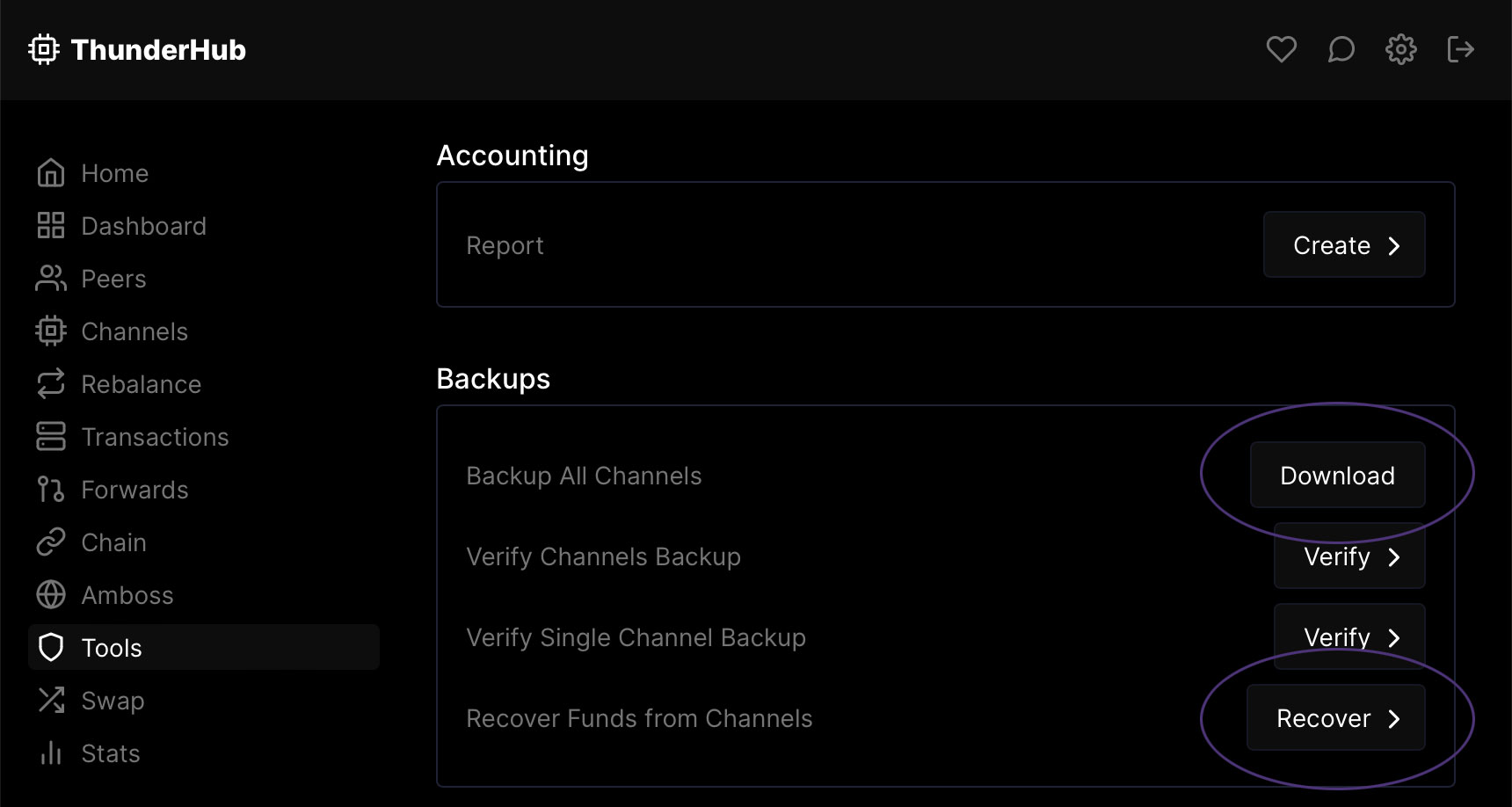 - Manual Backups: You can periodically copy your SCB file to external drives or another computer. Different wallets and LN tools provide the link to download in different places. In Thunderhub for example you can find it under Tools / Backups / Backup All Channels / Download.