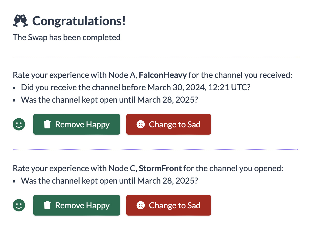 We launched a much requested feature Today. Previously, on Liquidity Swaps you could rate the node that was committed to open a channel to you. Now, you can also rate the node you opened a channel to, since they also have a committment to keep the channel open till the end of the agreement. You can rate nodes for the time of the agreement plus a week after the swap concluded.