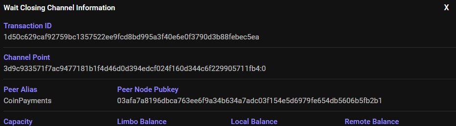 I am using Umbrel for run a Ligthing Node, I tried to close channel with CoinPayments Node, to reopen it in the future with bigger capacity, but after 5 days no progress (still pending on ThunderHub, Waiting to Close in RTL and LNDg) there is also no info about closing transaction. What I can do with this channel? (I had setup sufficient fee median for blockchain, it was not force close)