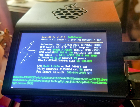 Raspberry PI4 with 8GB RAM + 1TB SSD running RaspiBlitz in a metal case optimized for passive cooling. This sucker is built like a tank and runs very reliably. CPU load typically floats around 50% and there's plenty of RAM. It's plugged into a dedicated UPS that can keep it running for about 12 hours.